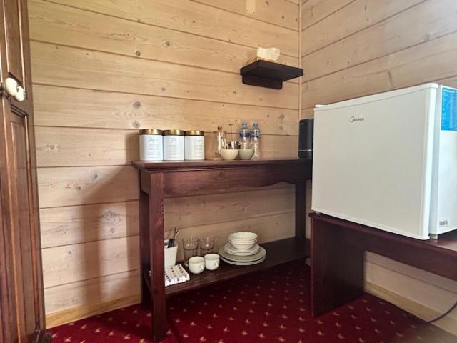 Wyposażenie obejmuje także lodówkę i czajnik.