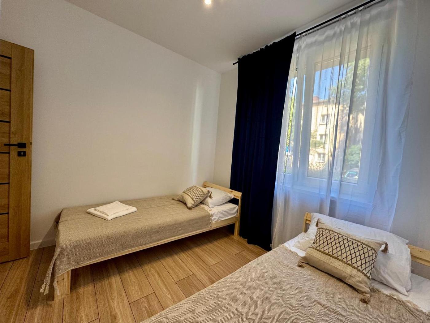 Apartament typu Deluxe z 3 sypialniami. This spacious apartment includes 1 living room, 3 separate bedrooms and 1 bathroom with a shower. The well-fitted kitchen features a refrigerator, kitchenware and an oven. This apartment has a dining area, heating and a flat-screen TV with streaming services. The unit has 9 beds. Apartament - 10 osobowy. Powierzchnia pokoju ok.: 75 mkw.